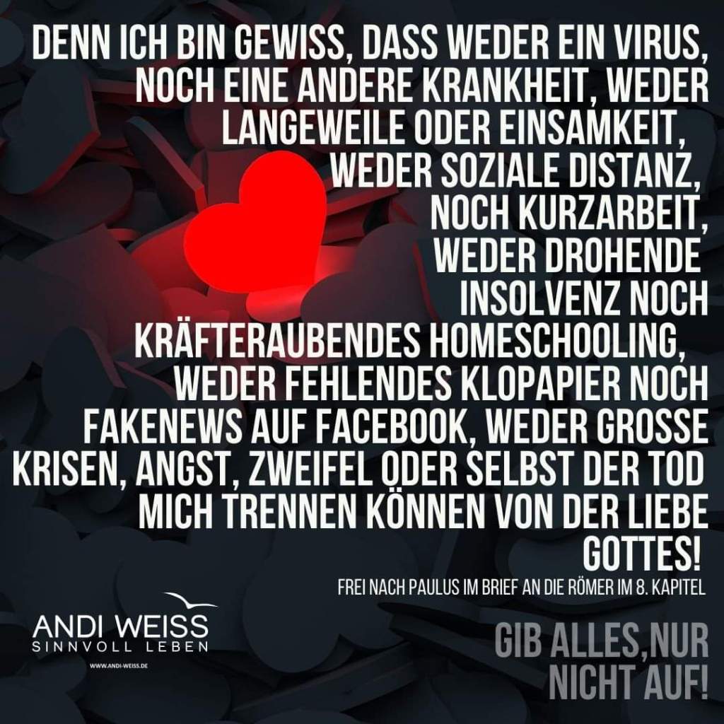 Welche Hoffnung habe ich nun in dieser aktuellen Situation? Worauf setzt Du/Sie deine/Ihre Hoffnung in dieser Situation? Was gibt mir persönlich meinen Halt und meine Hoffnung? Wir befinden uns mitten im Osterwochenende. Dieses Jahr anders als geplant, aber es ist Ostern. Folgender Vers des Musikers: Andi Weiss machte mir bei all dem Fragenkatalog und meiner Angst neuen Mut:1